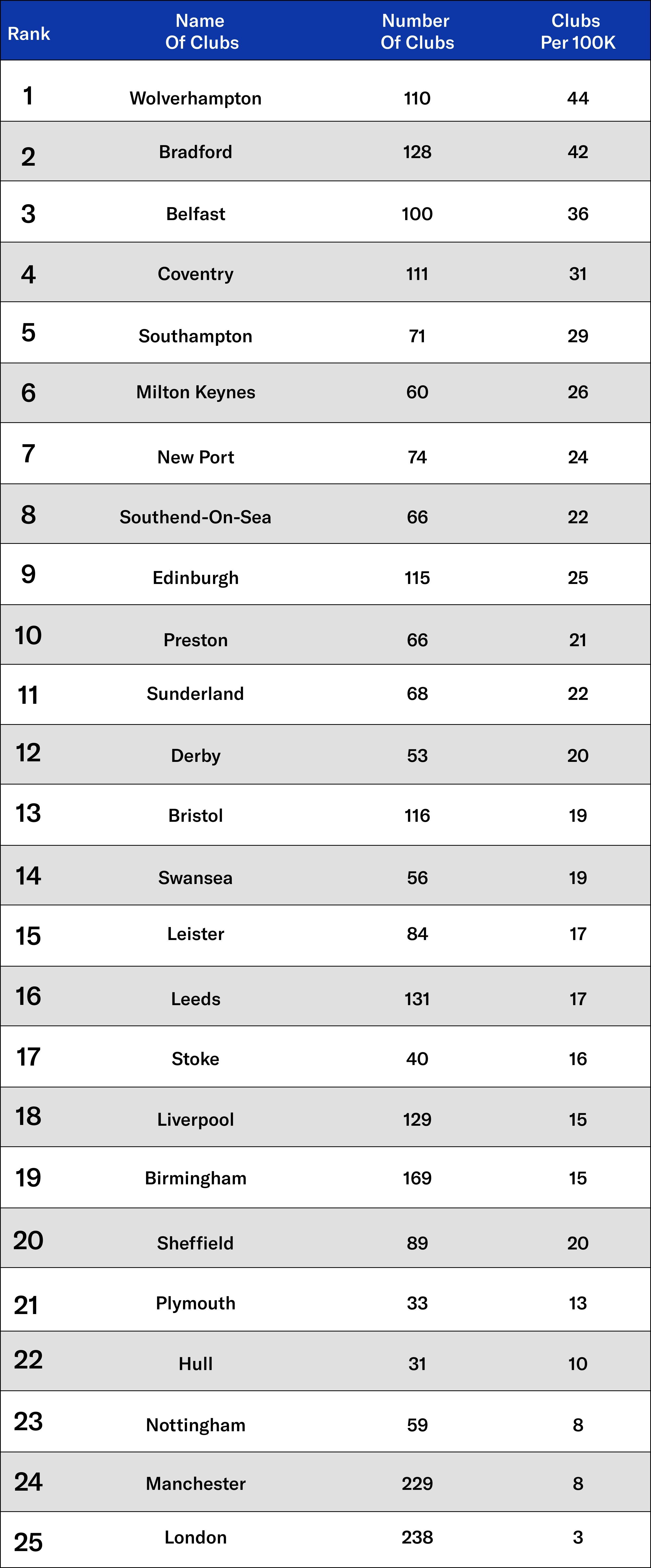 With 110 sports clubs, and 44 clubs per 100,000 people, Wolverhampton is the city best served by sporting facilities. Bradford comes in second place, with 42 clubs per 100,000, followed by Belfast, with 36.