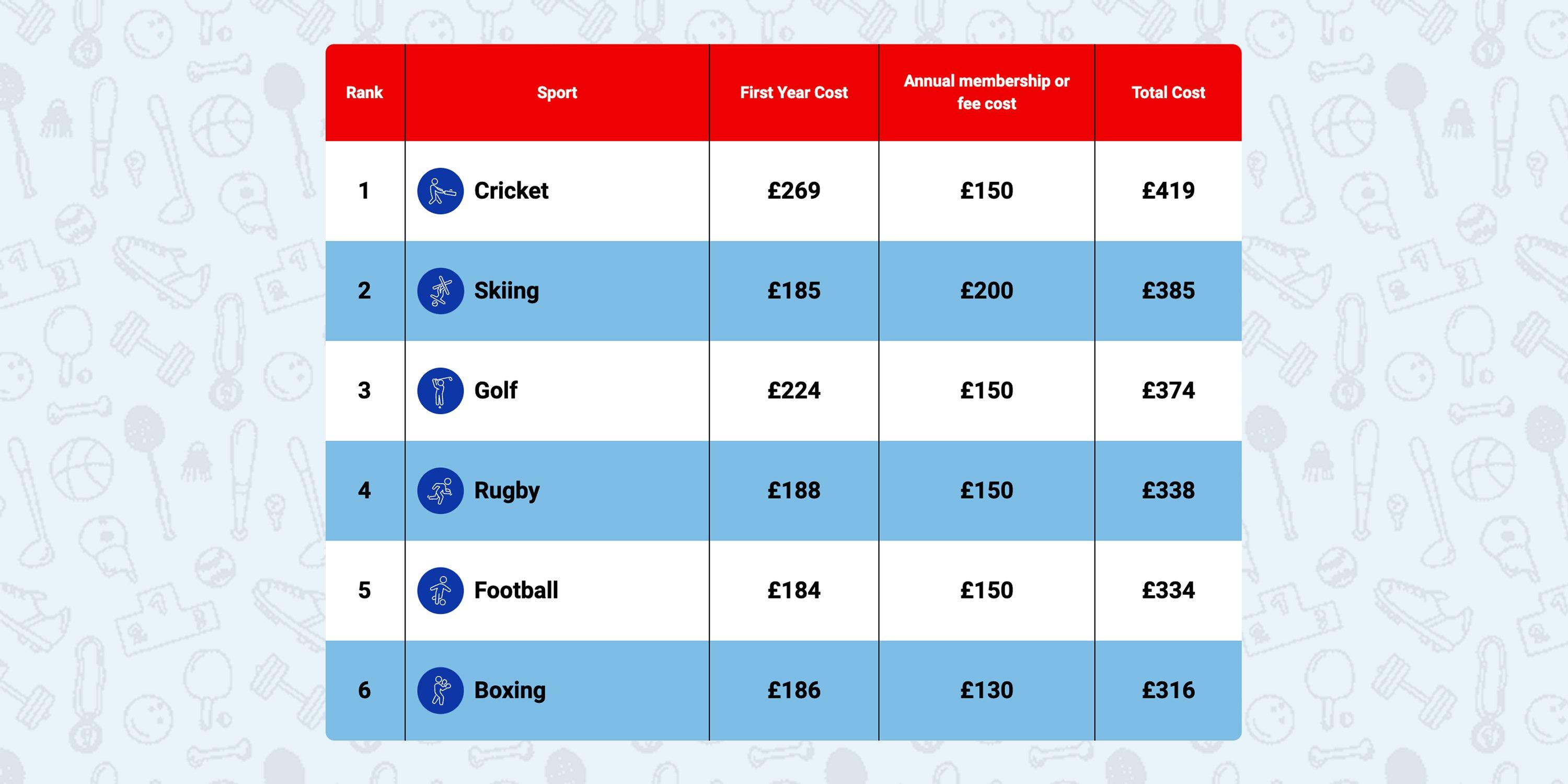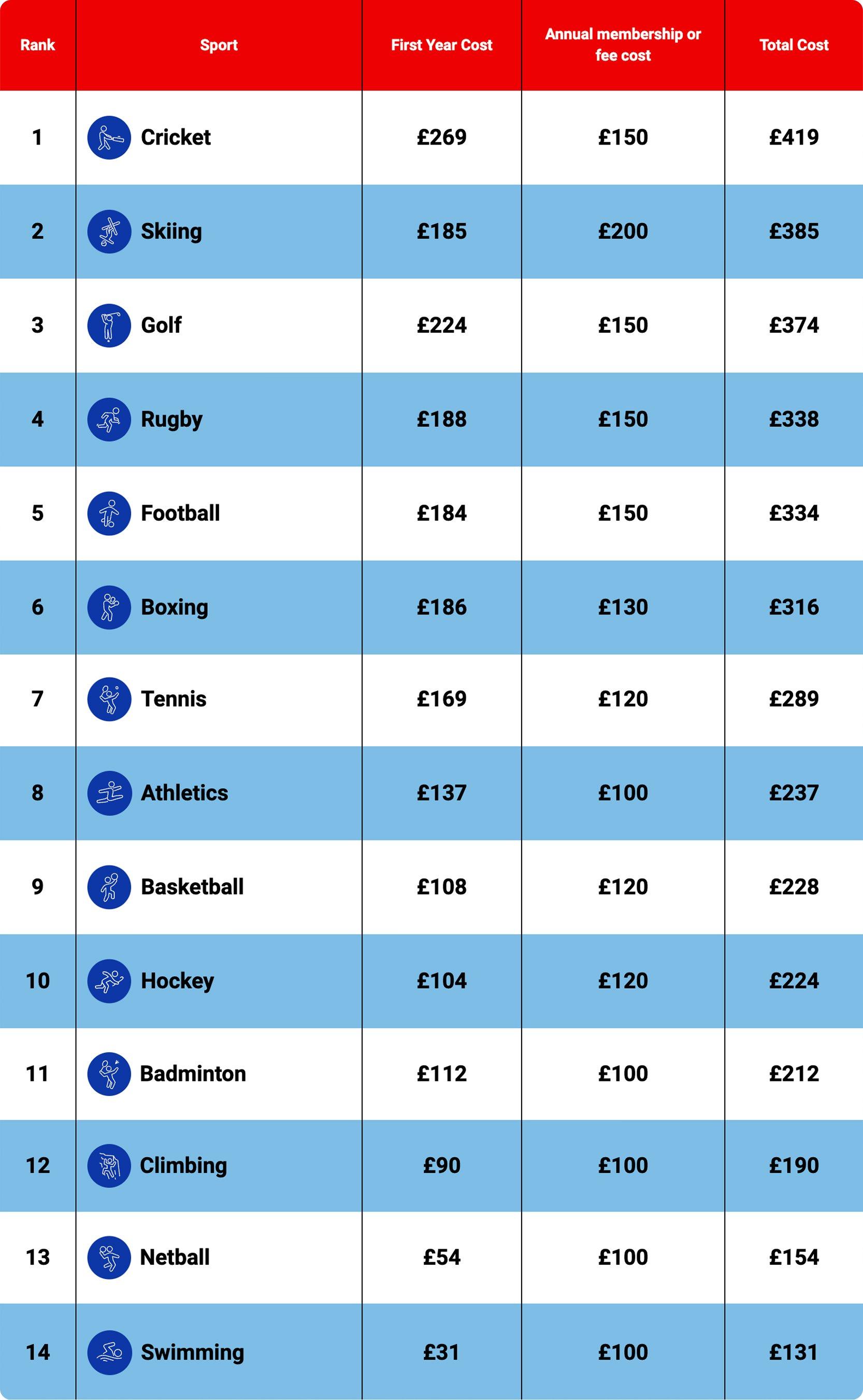 In second place, with a total cost of £385, is skiing. The winter sport has the most expensive participation fees, at £200, and purchasing the required clothing, protective equipment and accessories costs £185, although this does not include the skis themselves.